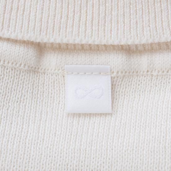襟ネームは後ろネックに控えめにあしらい、ホワイトのグラデーションで上品にまとめました。過度に主張することなく、けれども確かにそこに存在する――着る人の日常に自然に溶け込みながらも、ふとした後ろ姿に静かな個性を感じさせるディテールとして仕上げました。