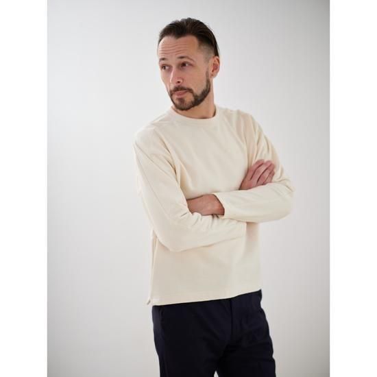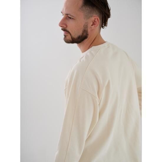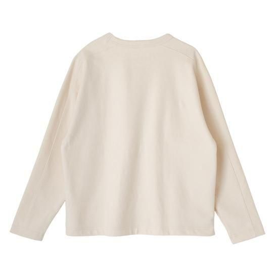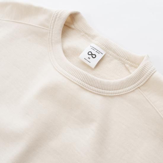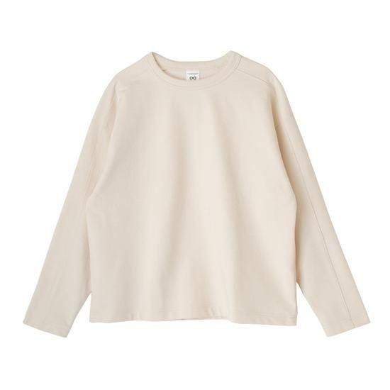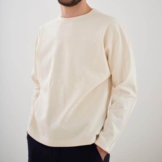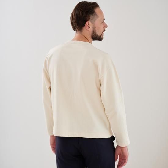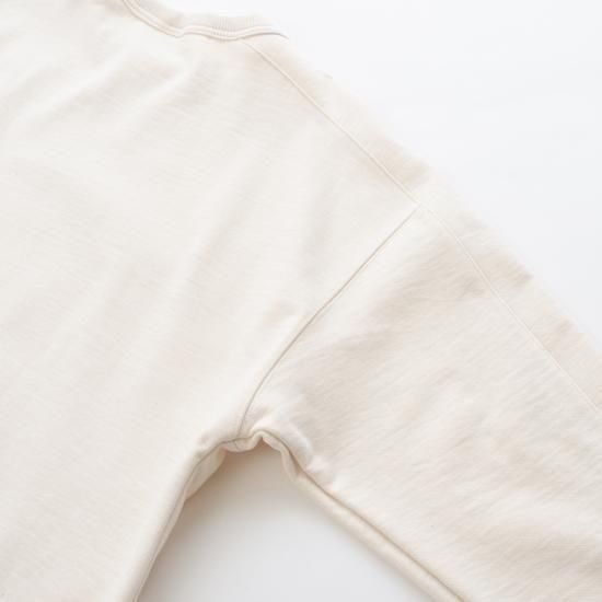 残り布を再構築する「残布シリーズ」から、長袖スウェットTが登場。国内で編み立てた度詰め裏毛は、しっかりとしたハリとコシを感じられる1枚。あえて綿本来の色を活かした無染色仕上げで、自然な風合いをそのまま楽しめます。エポーレットヨークスリーブが肩のラインをなめらかに見せつつ、可動域を高める設計。裾には両サイドスリットを入れ、動きやすさとデザイン性を両立しました。ユニセックスで着用できるシンプルかつ上質な一枚です。