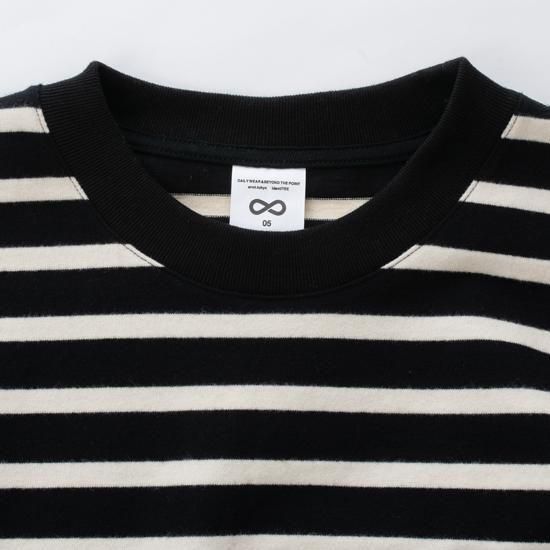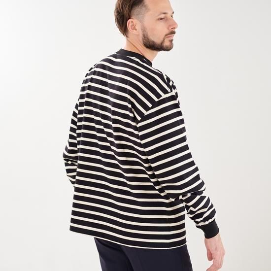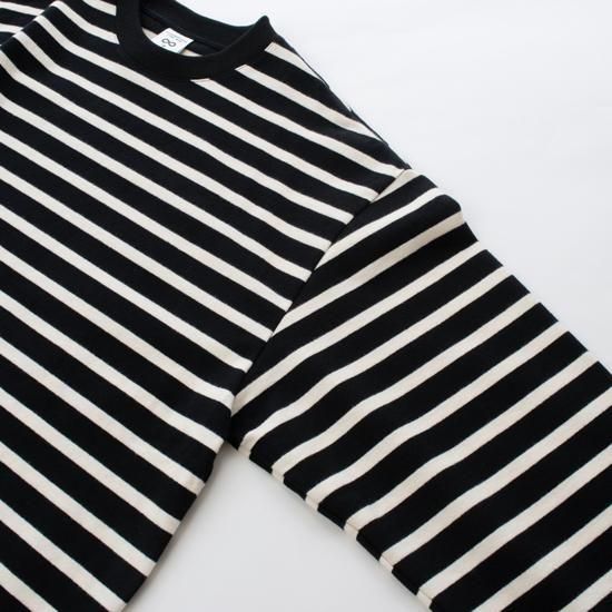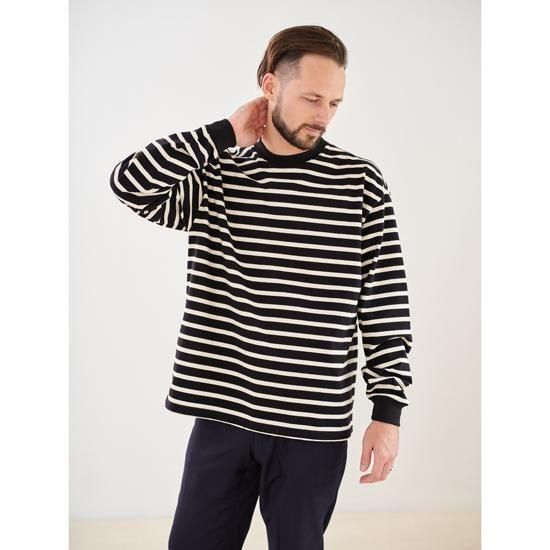 表面にほんのりと起毛を施した度詰め天竺は、日本製ならではの確かな質感と繊細な風合いが際立つ素材。秋冬らしい温もりを備えながらも、洗練された表情で大人の装いに自然に馴染みます。シックなブラックボーダーがスタイルにアクセントを加え、大人カジュアルを演出。